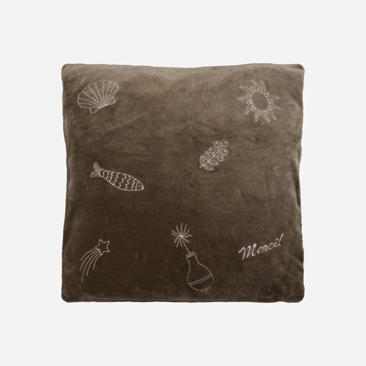 Dieser braune Kissenbezug aus weichem Baumwollsamt bringt verspielte Stickereien und Wärme in Ihr Zuhause. Seine einzigartigen, cremefarbenen Motive verleihen Ihrem Wohn- oder Schlafzimmer sowohl modernes Flair als auch eine verspielte Note.